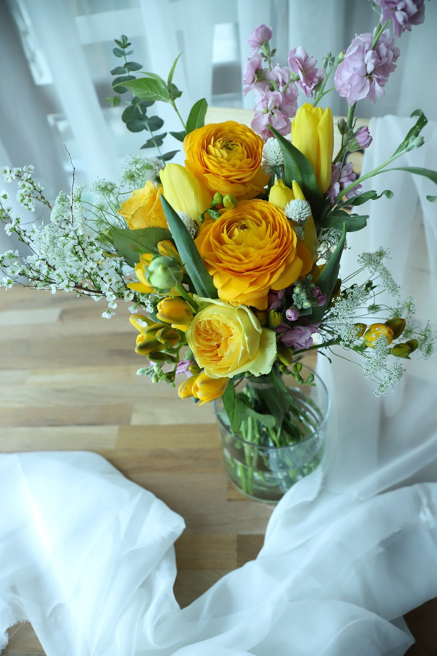 To keep your flowers fresh longer, place them in a clean vase with fresh water, cut the stems at a 45-degree angle, avoid direct sunlight, and remove any leaves below the water line. Changing the water every two days can also help.