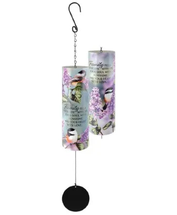 | This wind chime harmoniously combines artistry and sentimentality, featuring a UV-printed steel cylinder that carries a loving message about family. The design is both durable and aesthetically pleasing, with a visually soothing blend of nature-inspired graphics and calming colors. |